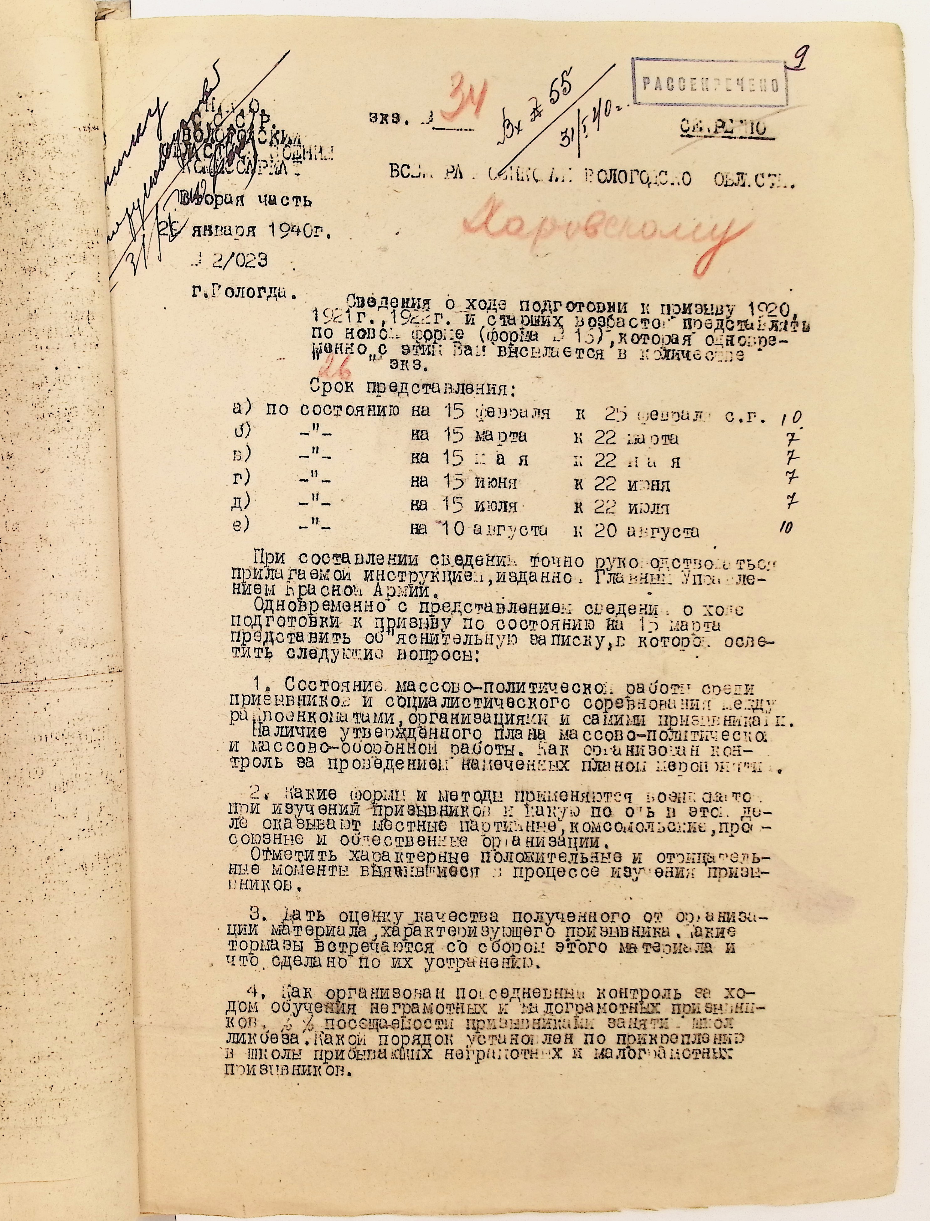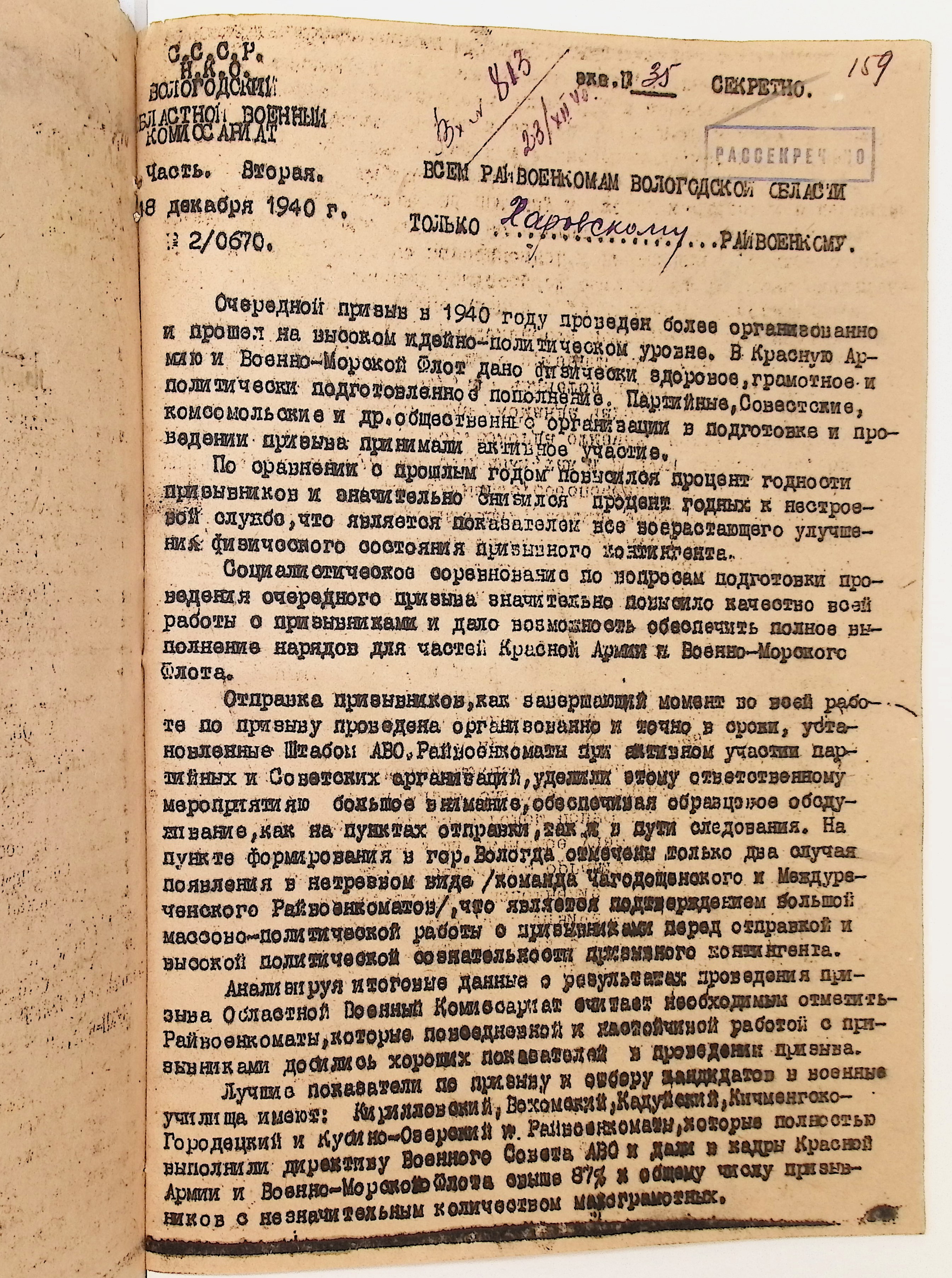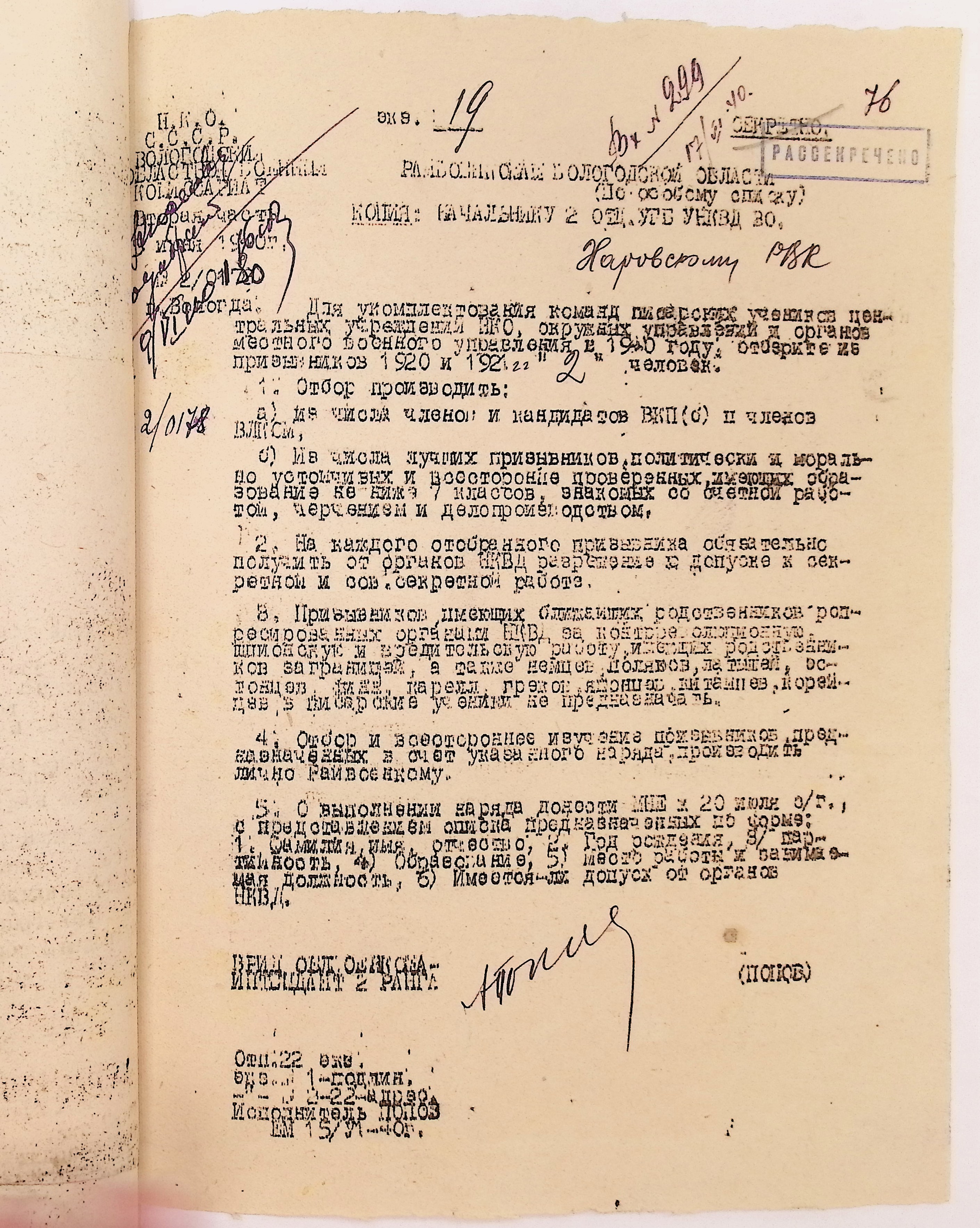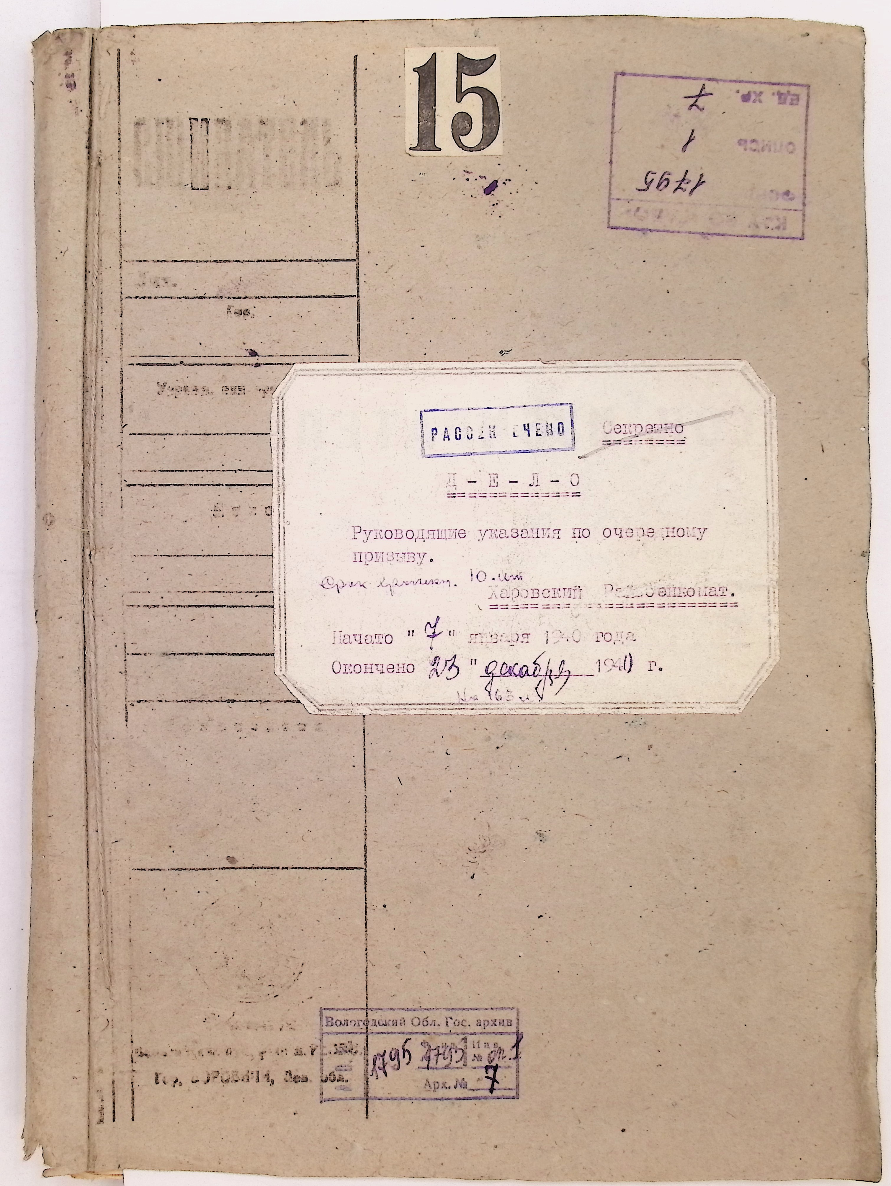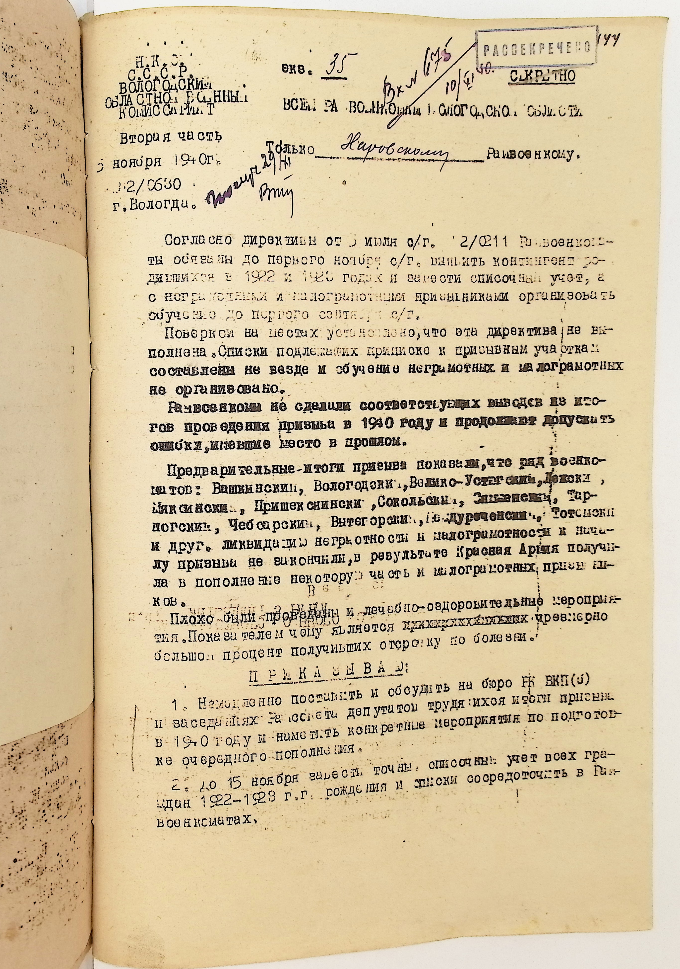 Руководящие указания по призыву. Харовский РВК (ГАВО. Ф. 1795 Оп. 1 Д. 7)