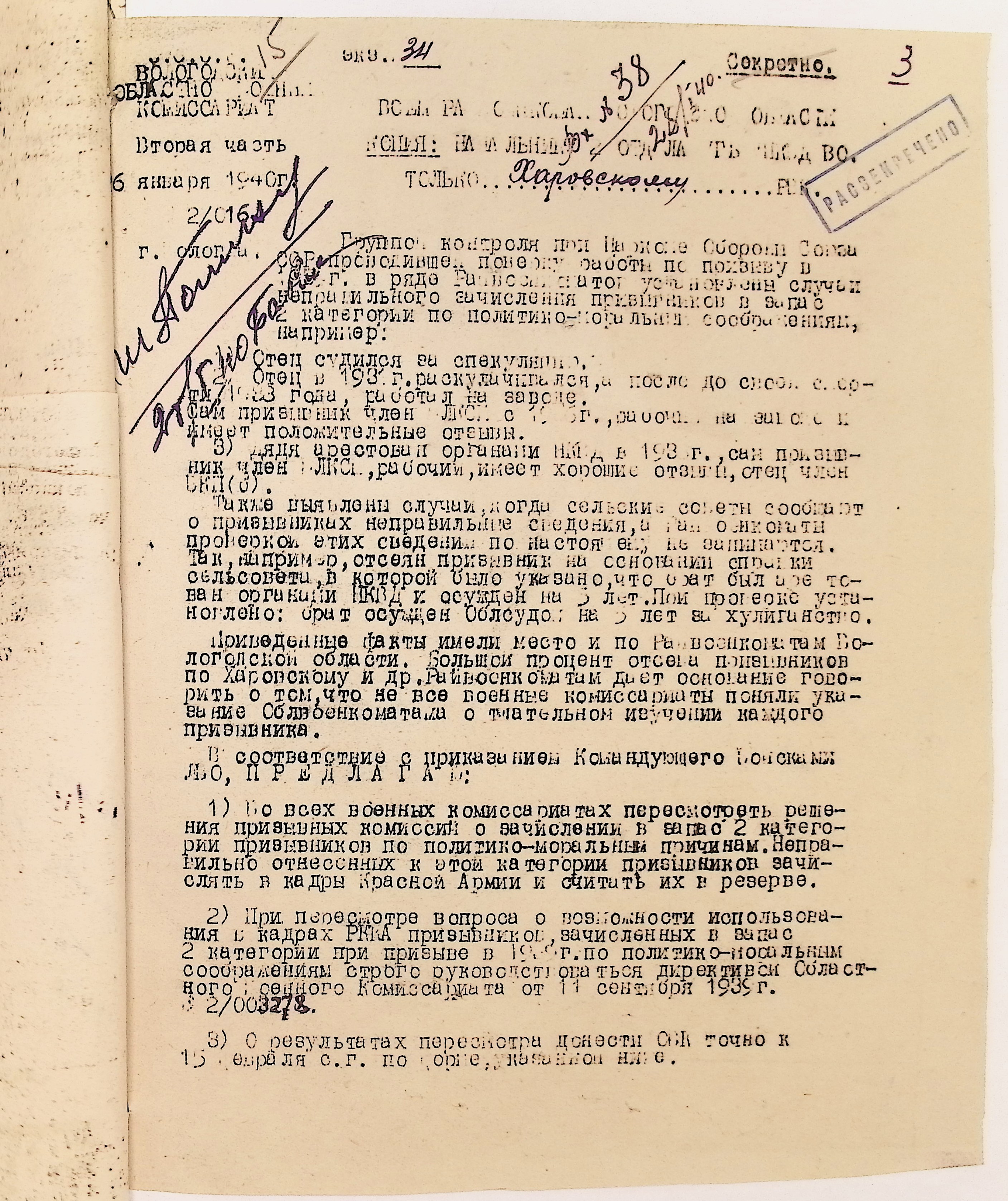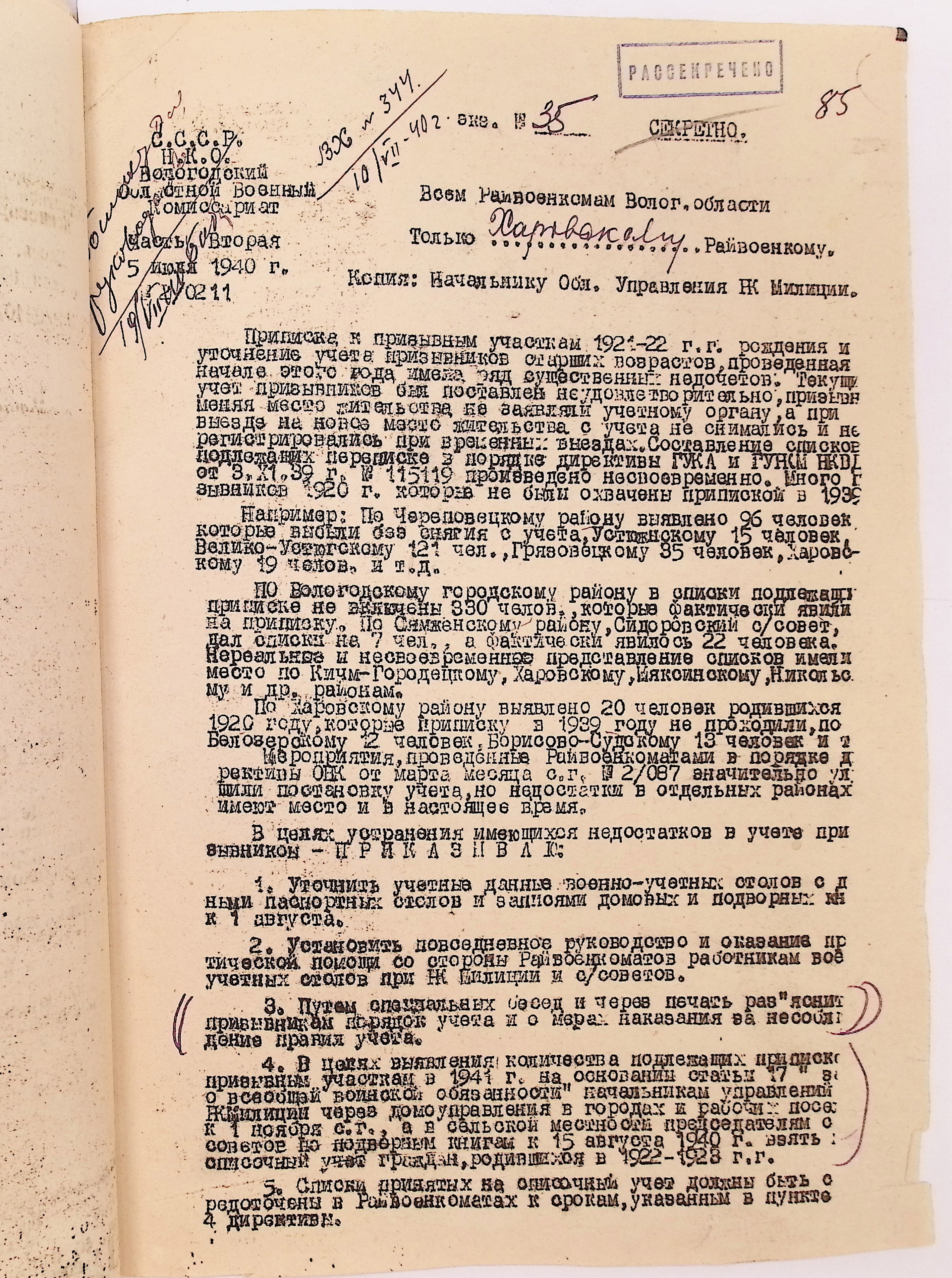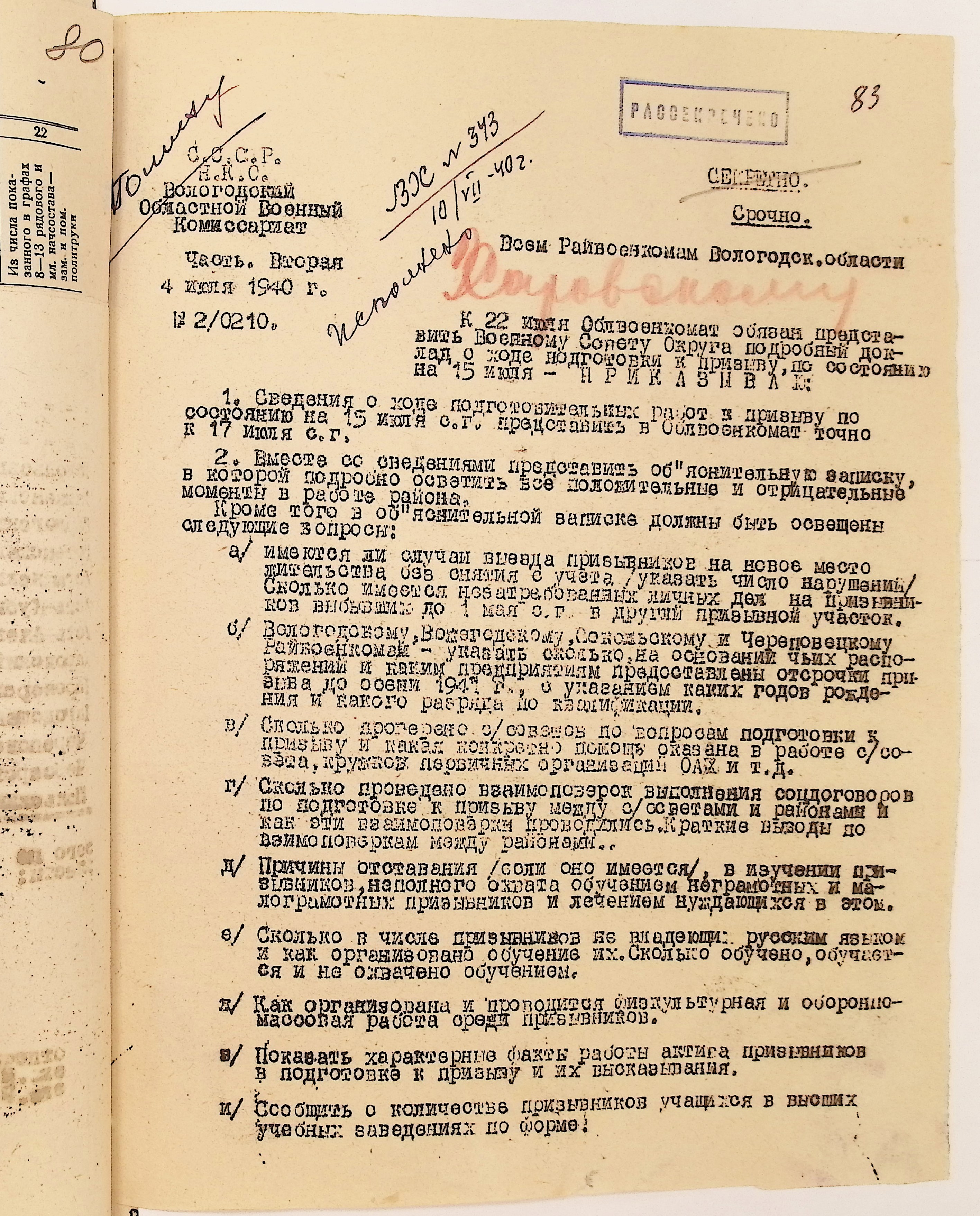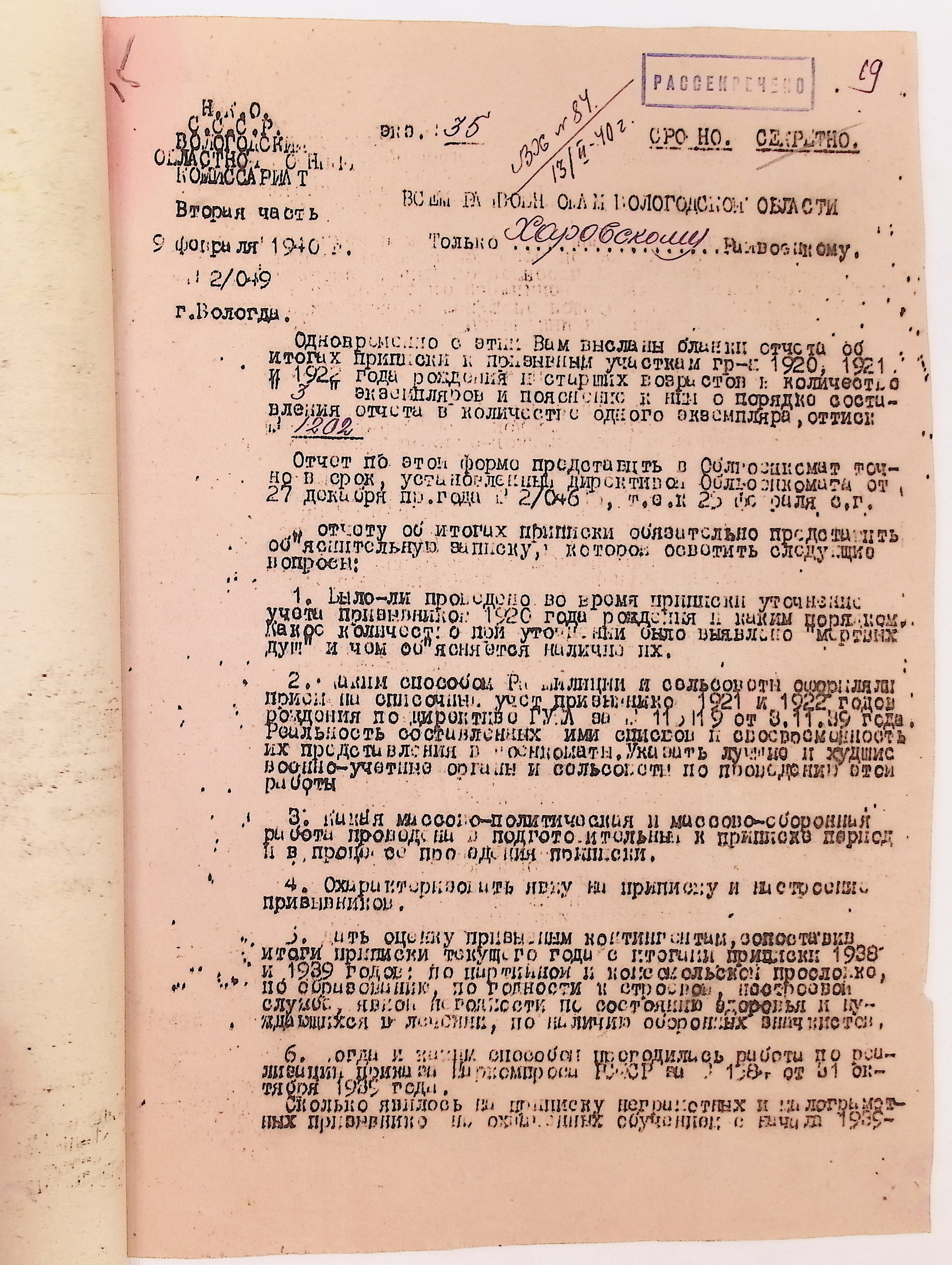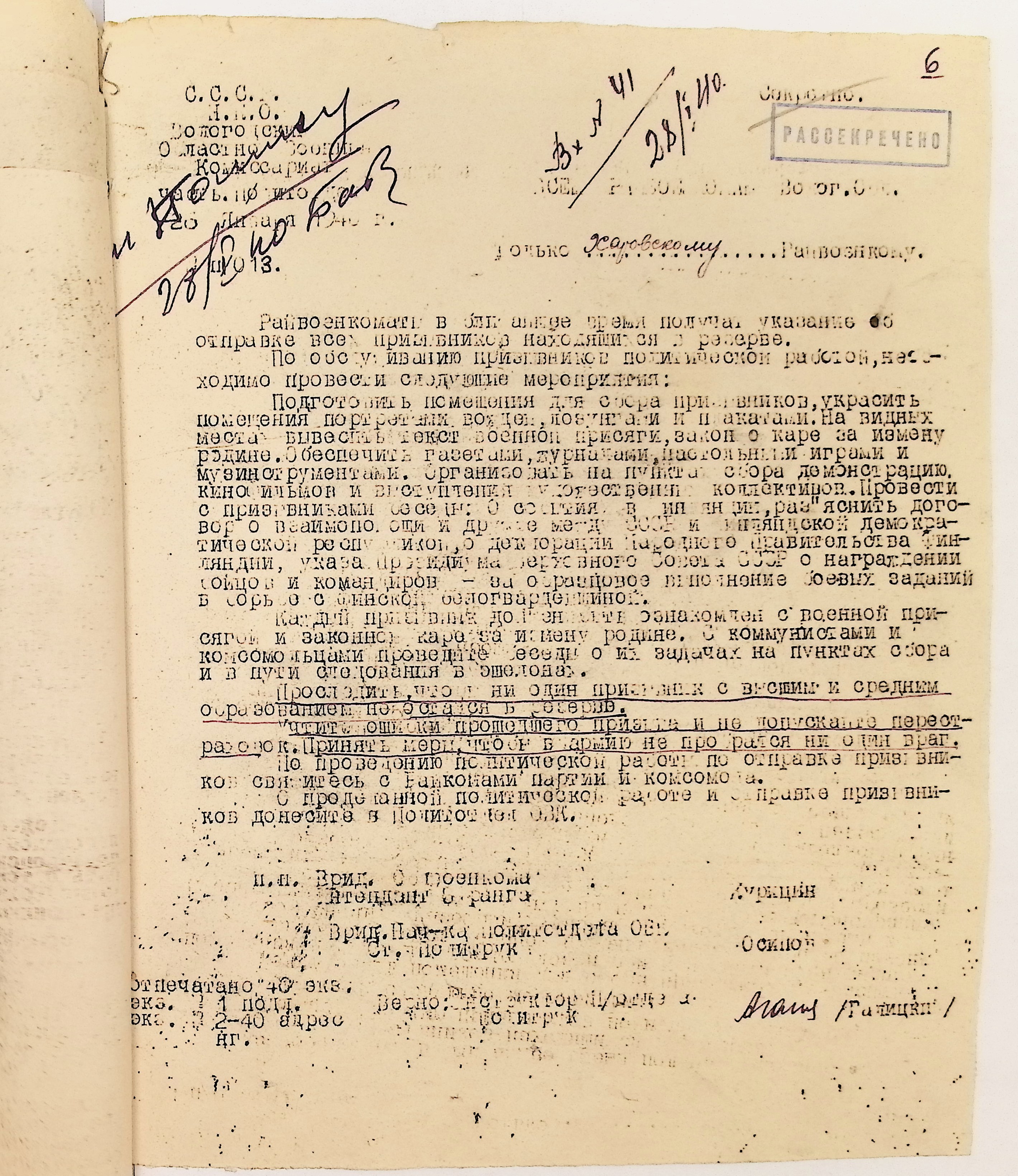 Руководящие указания по призыву. Харовский РВК (ГАВО. Ф. 1795 Оп. 1 Д. 7)