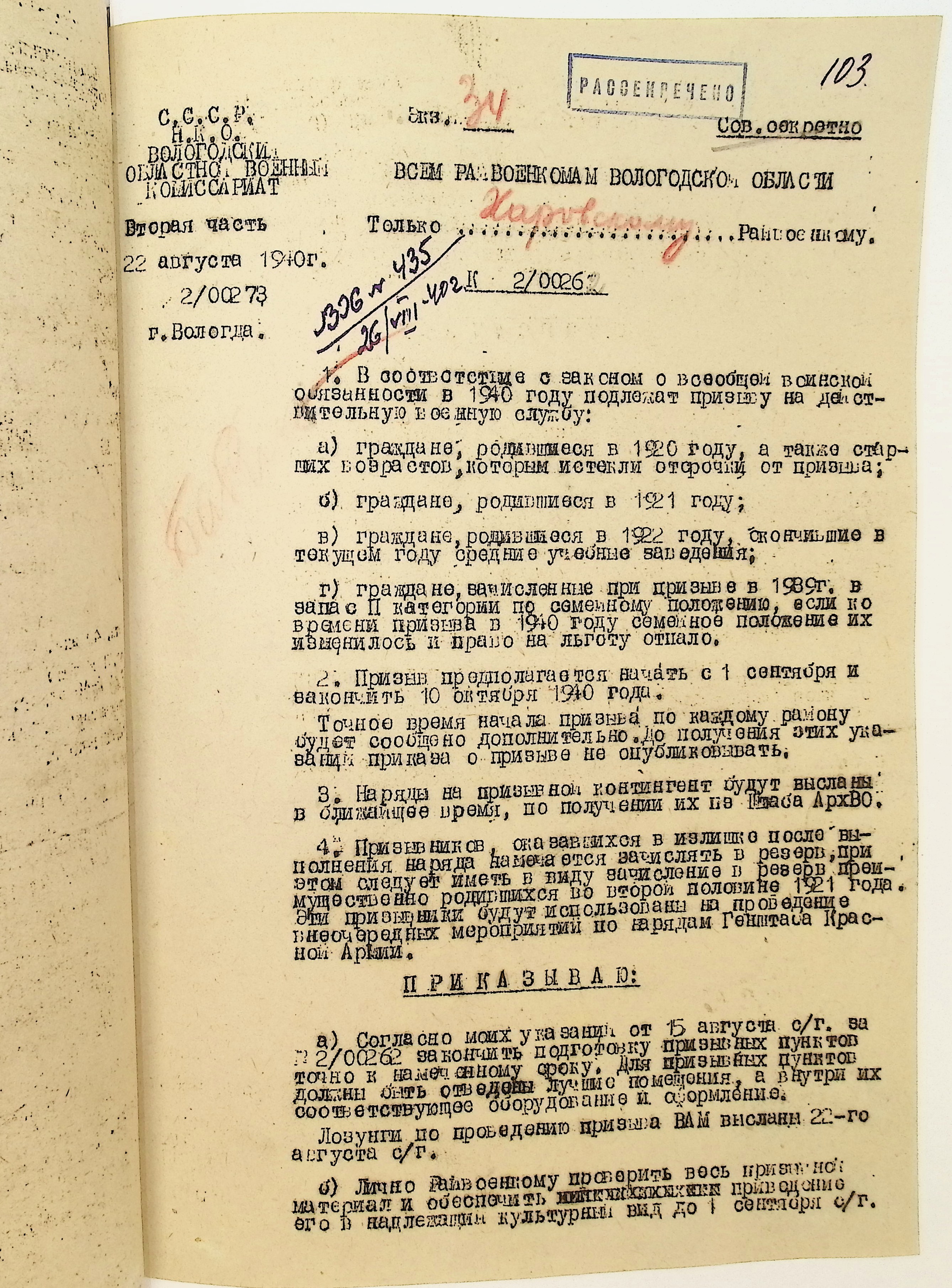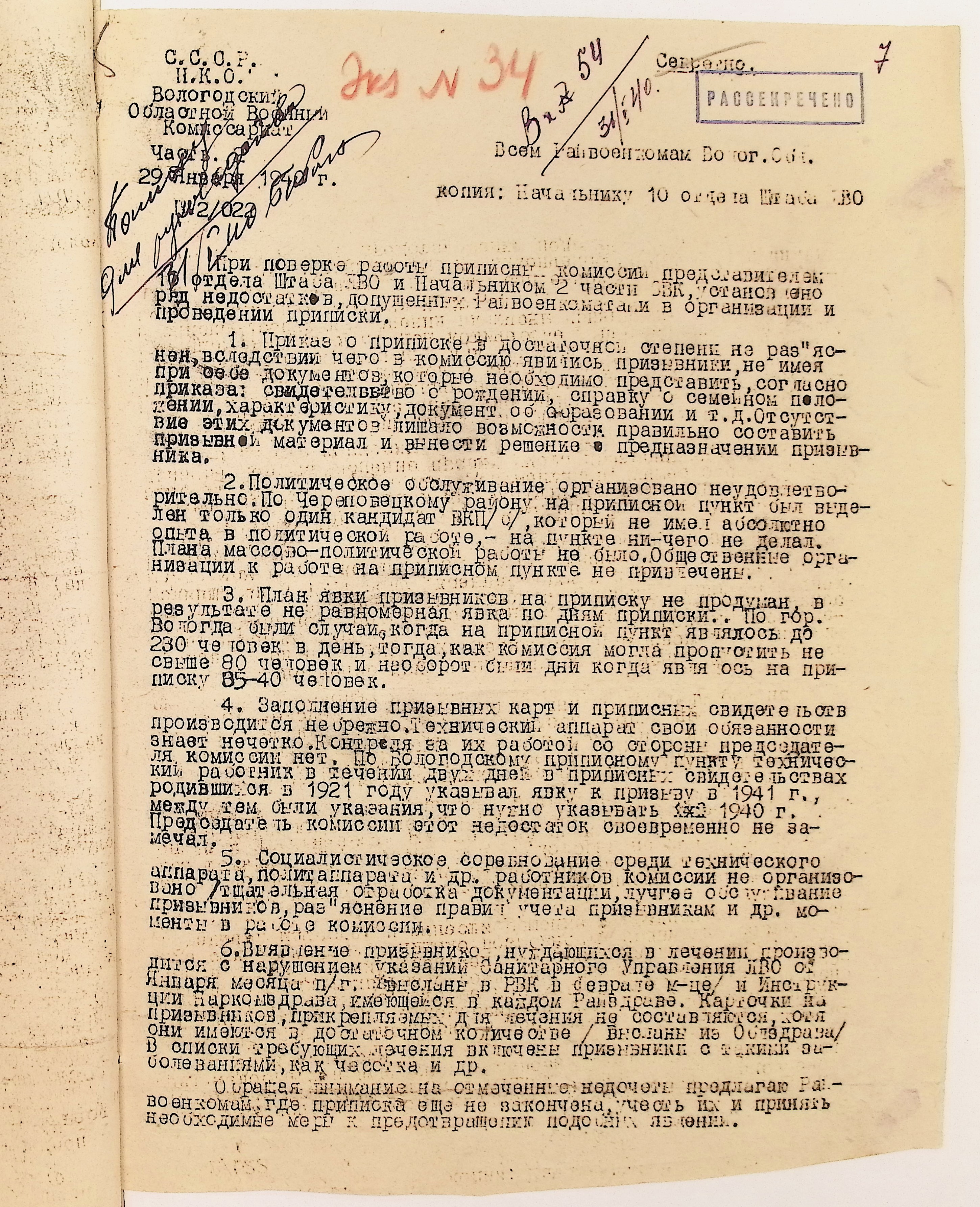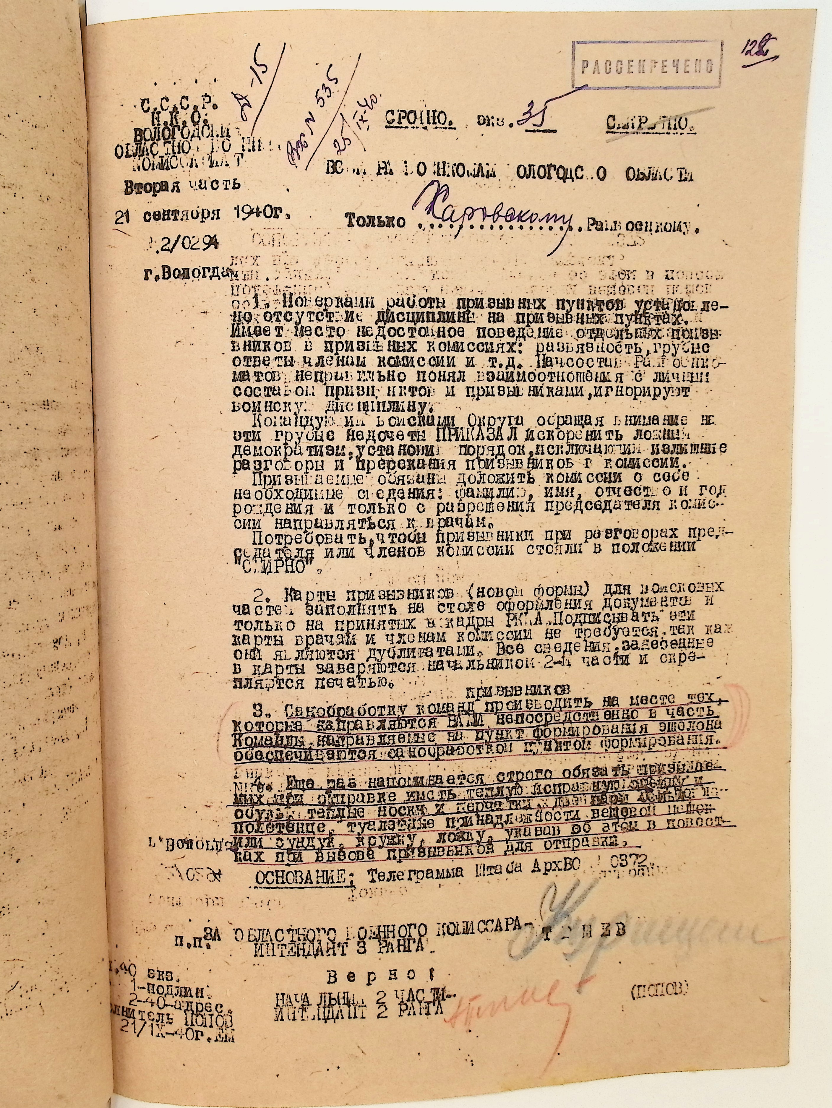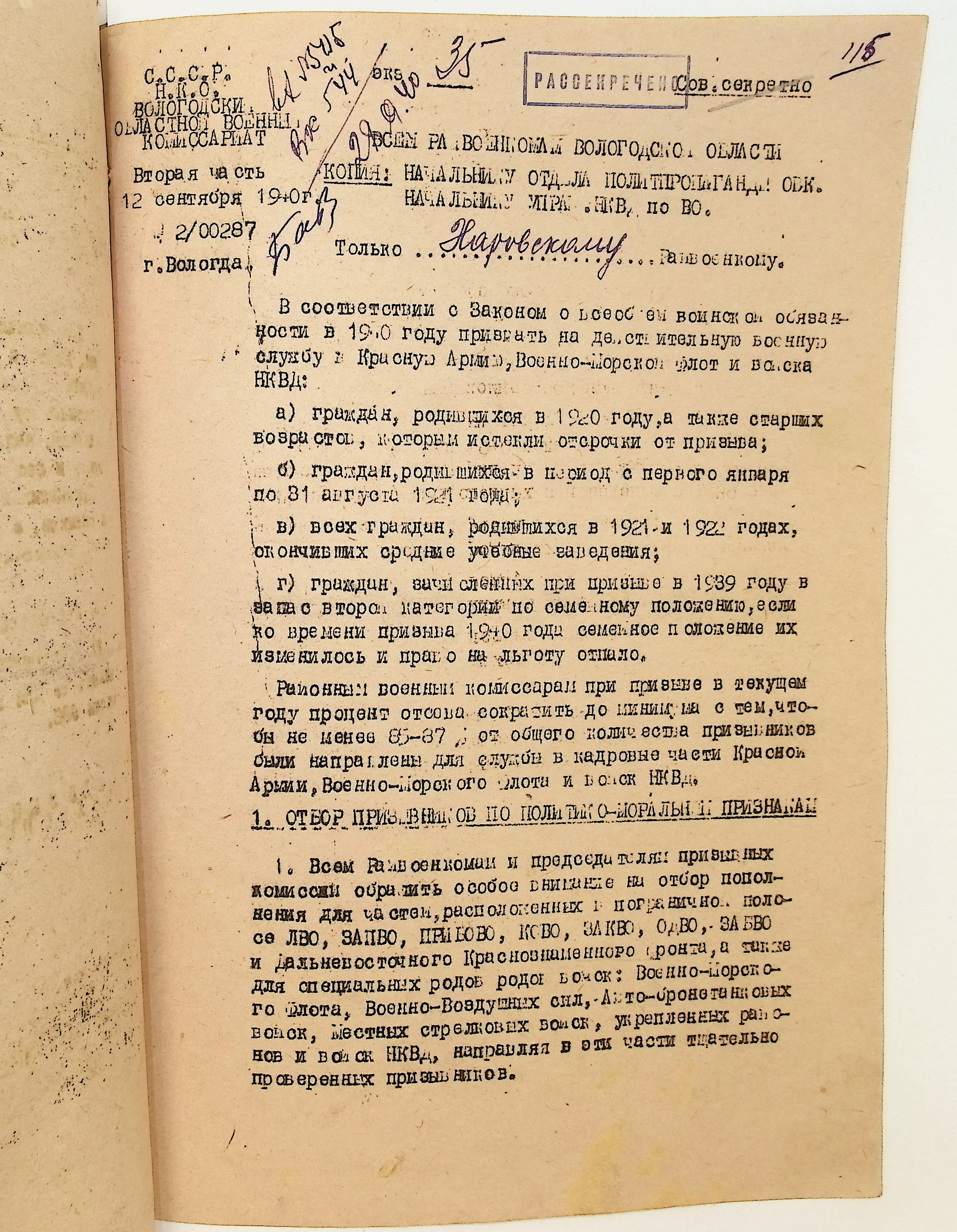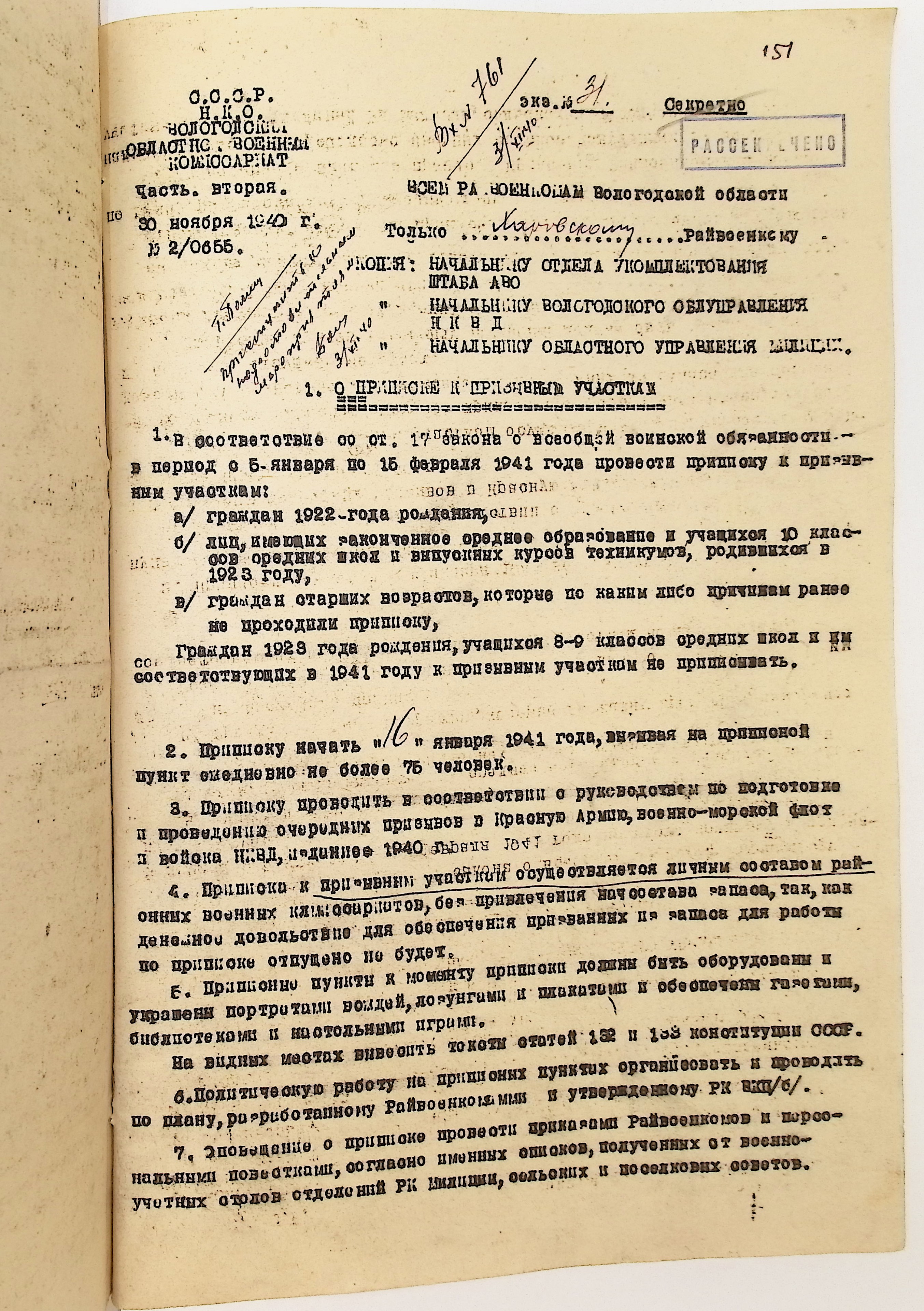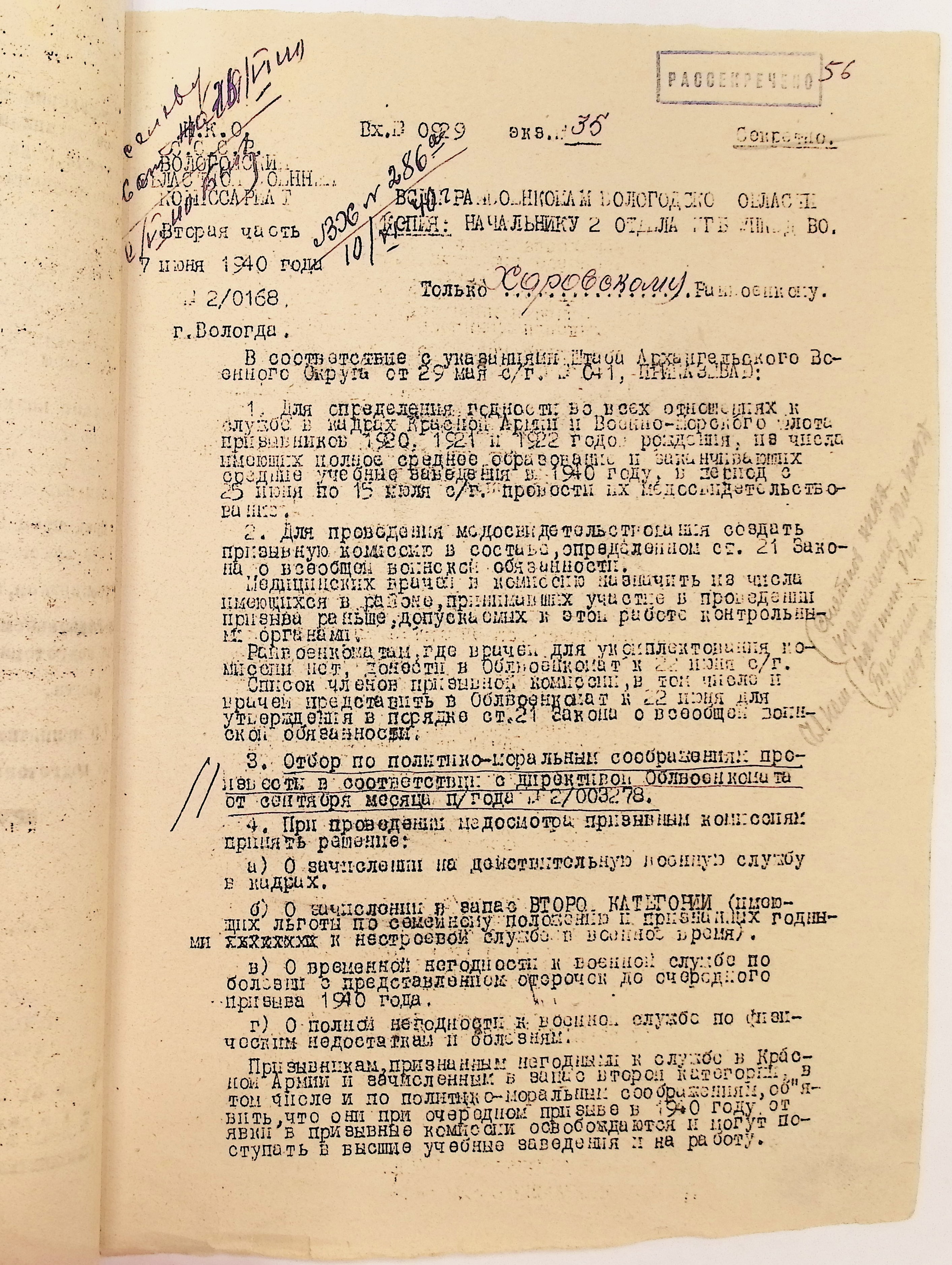 Руководящие указания по призыву. Харовский РВК (ГАВО. Ф. 1795 Оп. 1 Д. 7)
